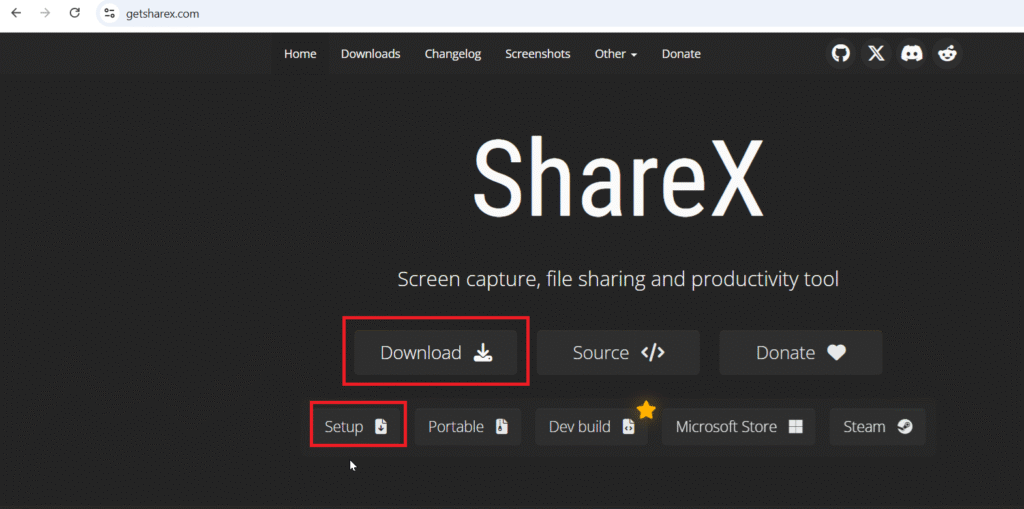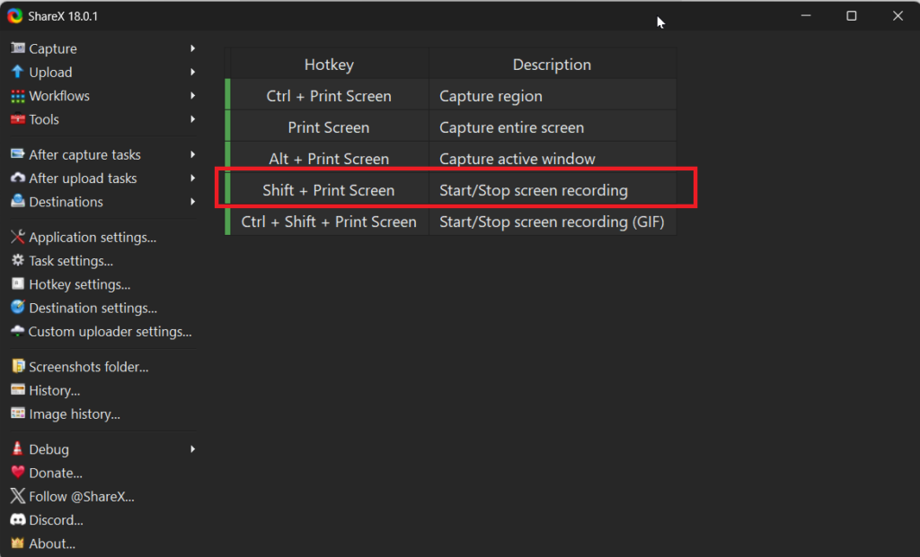 After installation open ShareX. On the main screen it lists hotkeys for recording screens.