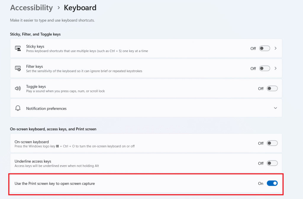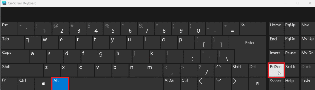 PrtScn can be used in two ways, depending on the selection in the keyboard settings (as shown below)