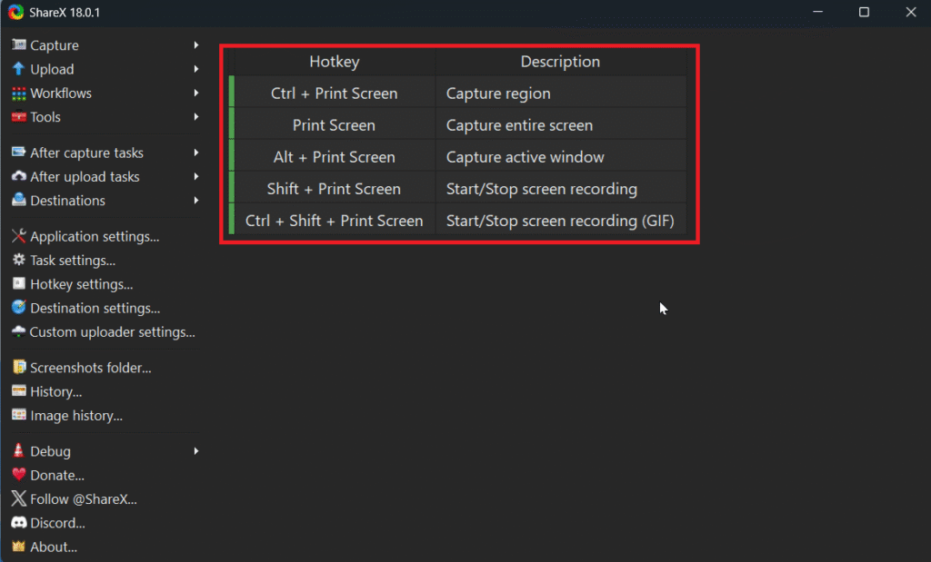 After installation, open ShareX. On the main screen it lists HotKeys for taking screenshot. Use any of these hotkeys to take screenshots as per your convenience.